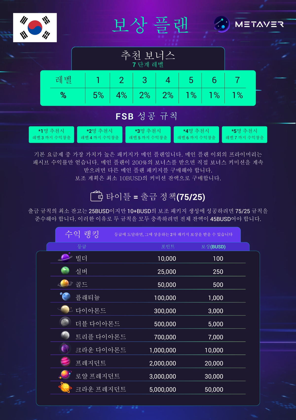 Metaver에 오신 것을 환영합니다 이자율과 수요에 맞추어 비즈니스 기회 창출을 극대화할 수 있도록 고안된 시스템입니다. 지속적인 수익을 실현하세요 높은 성장율로 수익과 보상을 실현시키는 맞춤형 비즈니스 플랜을 설계했습니다