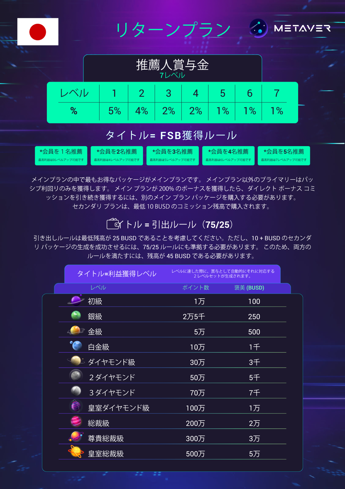 Metaverへようこそこのシステムは、ユーザーの興味とニーズに基づき、ユーザーにより多くのビジネスチャンスを獲得し、利益を上げ続ける。投資価値の向上Metaverからの利益を最大化する。ユーザーに合わせたビジネスプランと賞金や利益、継続的な著しい成長予測を持っている。